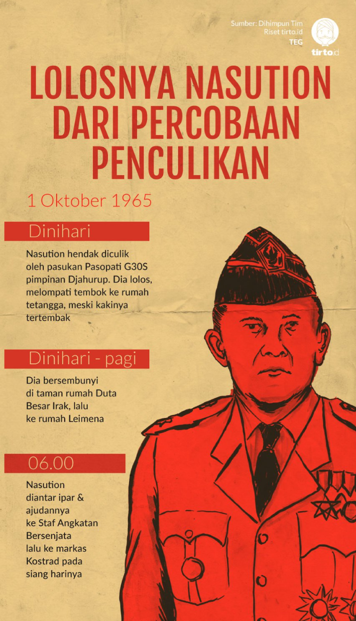 www.delikhukum.net – Perintah itu masih terngiang dalam ingatan Pembantu Letnan Dua Djahurup. Atasannya, komandan kompi Letnan Satu Dul Arif, memerintahkannya untuk “mengamankan” salah seorang jenderal. Menurut Dul Arif, negara dalam keadaan genting karena ada Dewan Jenderal yang hendak mengudeta Presiden Sukarno. Djahurup adalah salah satu anggota Kompi C batalion Kawal Kehormatan I Resimen Cakrabirawa yang bertugas menjaga keselamatan presiden. Rencananya, para jenderal yang mereka jemput dari rumahnya masing-masing akan dibawa ke Lubang Buaya pada dinihari 1 Oktober 1965. “Kalau ada [jenderal] yang membantah akan ditembak,” kata Djahurup saat jadi terdakwa di pengadilan, seperti dikutip Kompas (01/12/1967) yang dimuat dalam Presiden RI Ke II Jenderal Besar HM Soeharto dalam Berita 1965-1967 (2008). Djahurup dan pasukannya bertugas menculik Jenderal Abdul Haris Nasution yang menjabat sebagai Menteri Pertahanan dan Keamanan, juga merangkap Kepala Staf Angkatan Bersenjata. Ketika waktu menunjukkan pukul 03.00 dinihari 1 Oktober 1965, ia dan pasukannya berangkat dari Lubang Buaya menuju rumah Nasution di Jalan Teuku Umar nomor 40, Menteng. Menurut Frans Hitipeuw dalam Karel Sadsuitubun (1985:95), pasukan yang dipimpin Djahurup terdiri dari satu regu Cakrabirawa, satu peleton Yon 530 Brawijaya, satu peleton Yon 454 Diponegoro, satu peleton Pasukan Gerak Cepat AURI, dan satu peleton Pemuda Rakyat. Kedatangan pasukan itu membuat Sunarti, istri Jenderal Nasution tidak bisa tidur lagi. Ia segera memberitahu suaminya soal kehadiran pasukan tersebut. Nasution pun bangun dan menuju pintu depan hendak melihatnya. “Ketika pintu dibuka, anggota penculik segera melepaskan tembakan ke arah Jenderal TNI A.H. Nasution,” tulis penyusun buku Gerakan 30 September Pemberontakan Partai Komunis Indonesia (1994:96) yang diterbitkan Sekretaris Negara. “Seketika itu beliau menjatuhkan diri ke lantai, dan Ibu Nasution cepat-cepat menutup dan mengunci pintu kamar kembali,” imbuhnya. Meski kakinya sempat tertembak, namun Nasution berhasil kabur dengan melompati tembok. Pasukan yang dipimpin Djahurup akhirnya hanya mendapati orang yang potongannya mirip Nasution, yakni ajudannya yang bernama Pierre Andreas Tendean yang berpangkat Letnan Satu Zeni. Pierre pun dibawa oleh para penyerang yang berpacu dengan waktu menuju ke Lubang Buaya. Ia kemudian dibunuh dan dimasukan ke dalam sumur tua. Tak hanya Pierre, anak Nasution pun menjadi korban. Punggung Ade Irma Suryani terkena tembakan hingga kritis, dan akhirnya meninggal dunia pada 6 Oktober 1965 di Rumah Sakit Pusat Angkatan Darat (RSPAD) Jakarta. Selain keduanya, seorang polisi dari Brimob pun menjadi korban. Karel Satsuit Tubun yang menjaga rumah Johannes Leimena—menteri koordinator dalam Kabinet Dwikora yang bertetangga dengan Nasution—juga ikut terbunuh setelah melakukan perlawanan. Seperti dicatat Frans Hitipiuew dalam Karel Sadsuitubun (1985), demi melancarkan penculikan Nasution, rupanya pengawal di rumah Leimena juga ikut dilumpuhkan.