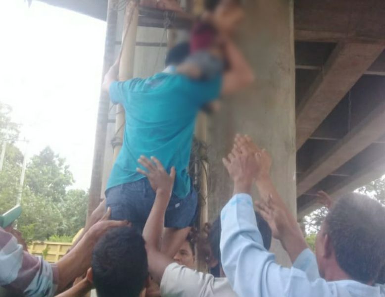 Namun warga berinisiatif menggunakan tangga dan tali naik di atas tiang penyangga sambungan jembatan dan mengeluarkan balita naas tersebut dari celah sambungan jembatan.