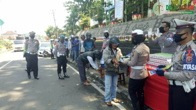 Sekitar 300 masker dan 150 Nasi kotak dibagikan kepada pengguna jalan yang terlebih dahulu diberhentikan personel Sat Lantas.