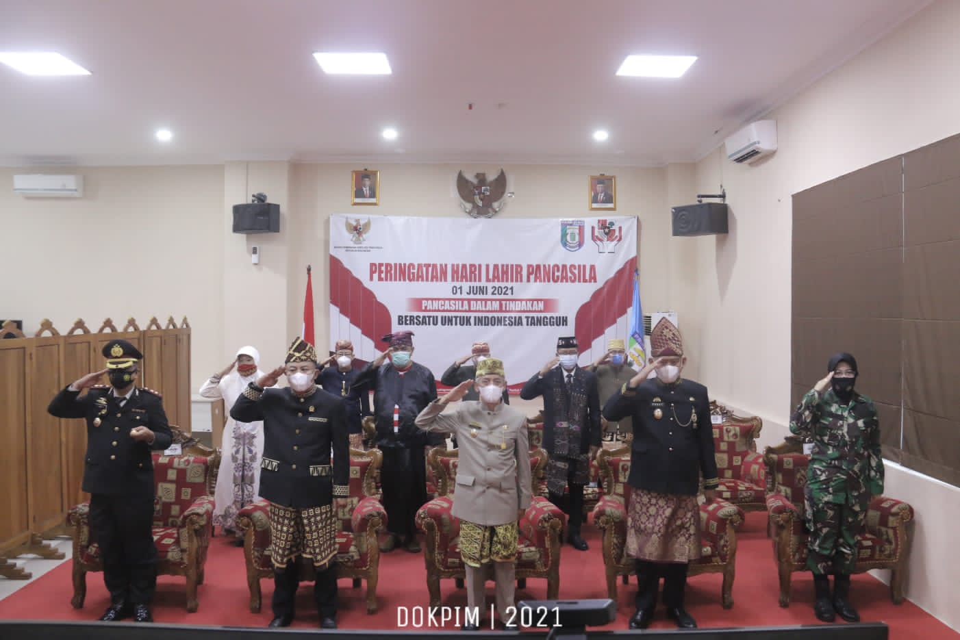 PRINGSEWU,www.delikhukum.net – Bupati Pringsewu H.Sujadi dan Wakil Bupati Pringsewu DR.H.Fauzi, SE, M.Kom., Akt., CA, CMA bersama jajaran Pemerintah dan Forkopimda Kabupaten Pringsewu mengikuti upacara peringatan Hari Lahir Pancasila secara virtual dengan Inspektur Upacara Presiden RI Joko Widodo dari Gedung Pancasila, Jakarta, Selasa (1/6/21). Upacara kali ini mengangkat tema ‘Pancasila dalam Tindakan, Bersatu untuk Indonesia Tangguh’.