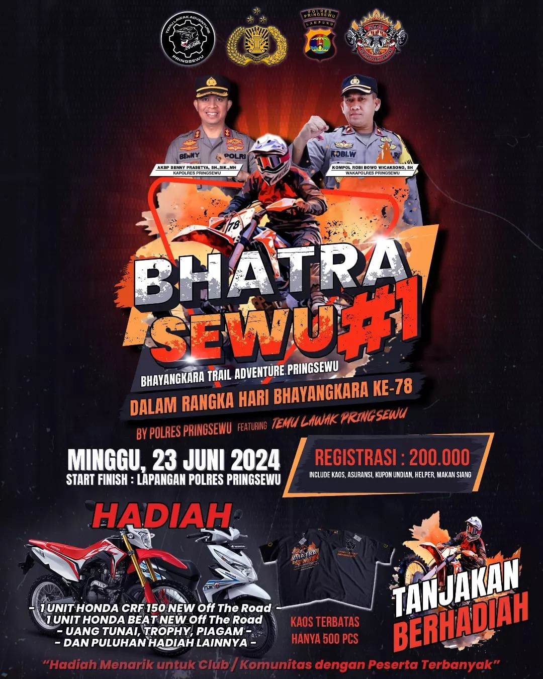 Wakapolres Pringsewu juga menambahkan bahwa kesempatan masih terbuka bagi para raider yang ingin mengikuti event ini hingga besok pagi sebelum acara dimulai. “Kami mengajak para pecinta motor trail untuk mensukseskan acara ini. Bagi yang berminat, cukup mendaftar dengan biaya registrasi sebesar Rp. 200 ribu, sudah termasuk kaos, asuransi, kupon undian, helper, dan makan siang,” jelas Kompol Robi.